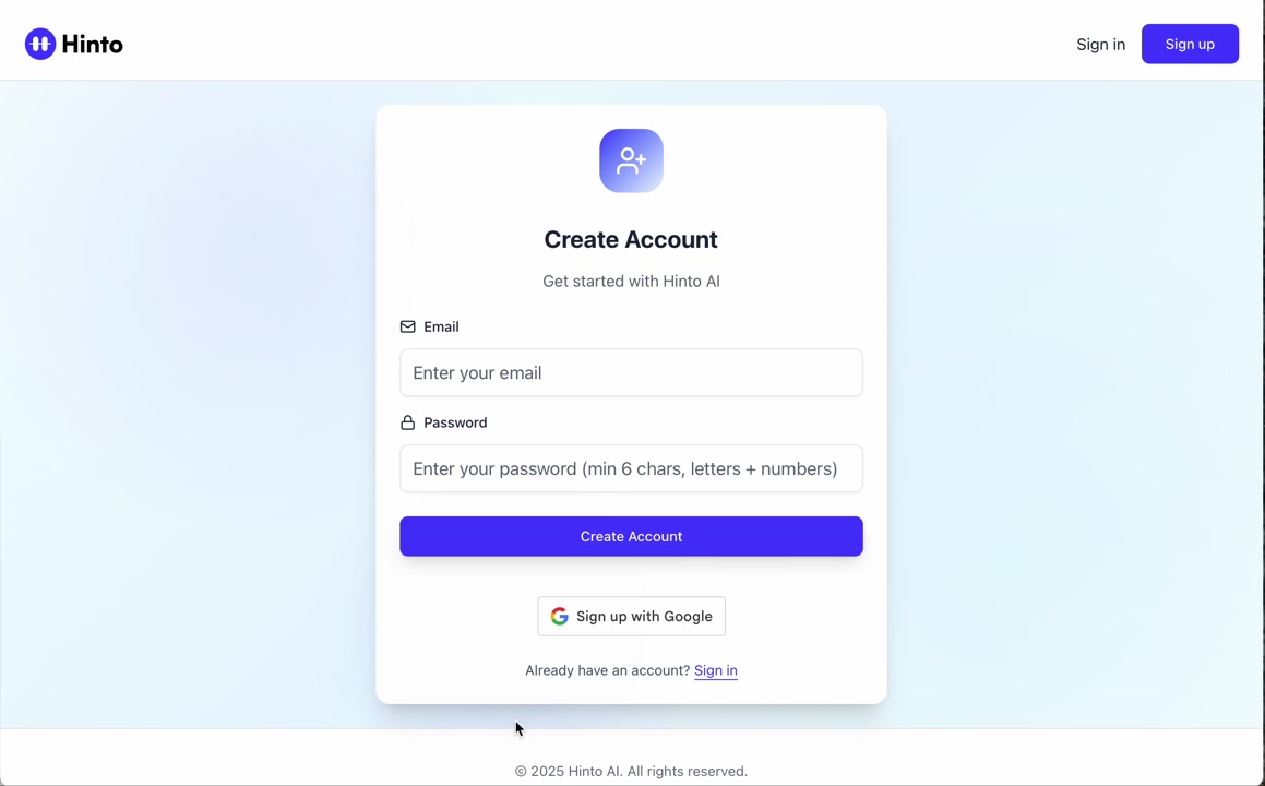 Hinto AI allows you to create an account and sign in using your existing Google account for a faster and more secure experience. This option is available on the main sign-up and sign-in pages, streamlining your access to the platform without needing to manage a separate password.