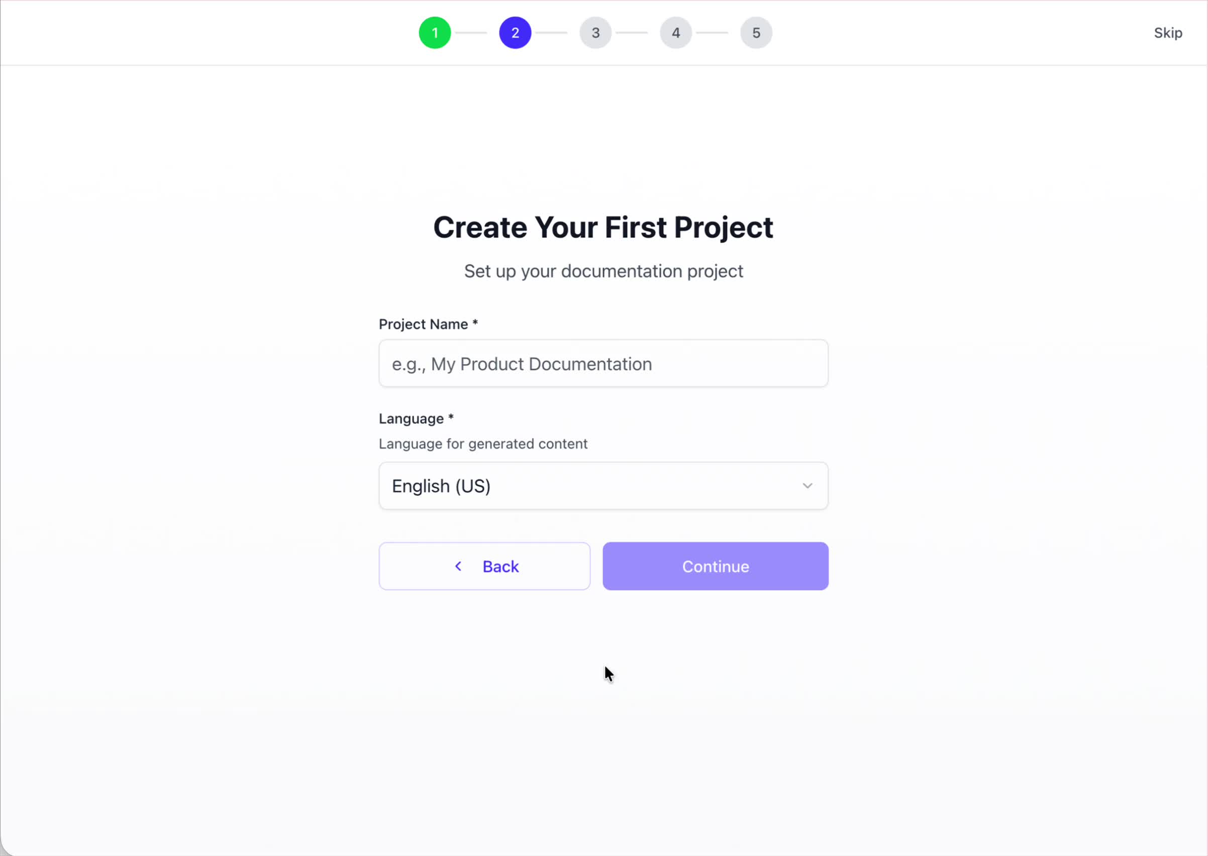 If you prefer to explore the dashboard immediately, you can click the **Skip** button located in the top-right corner of the screen at any point during the onboarding process. This will take you directly to your project space.