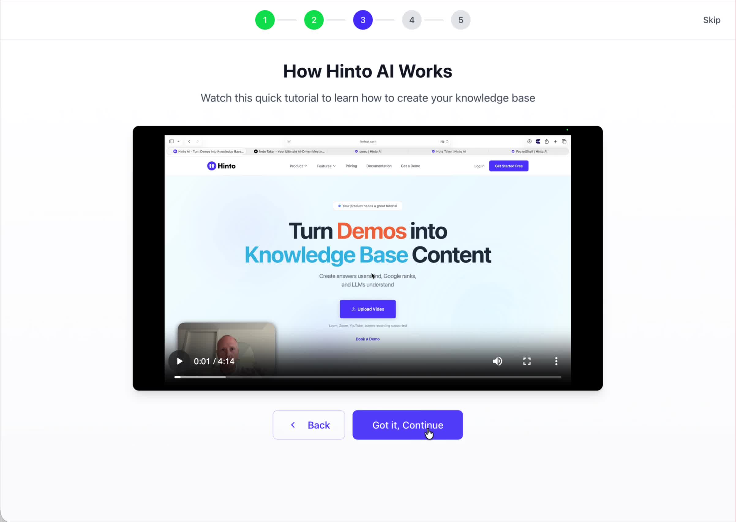 A brief tutorial video will appear, providing a quick overview of how Hinto AI transforms your demos into a knowledge base. Watching this video is a great way to get acquainted with the platform's core functionality. When you are finished, click **Got it, Continue**.