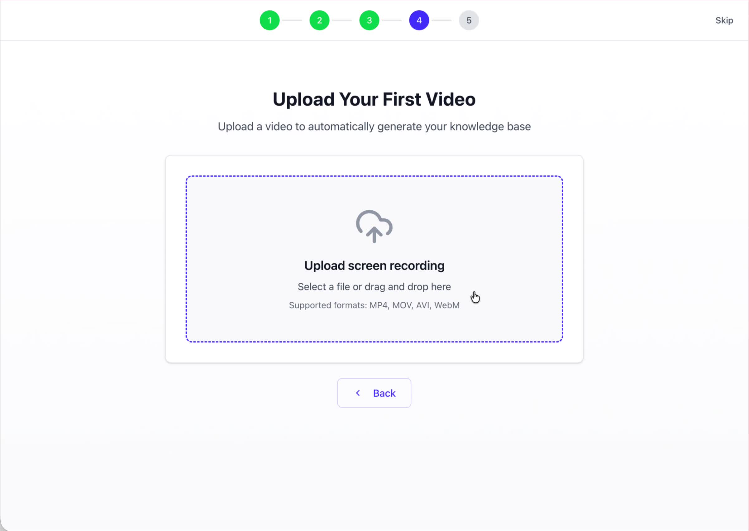 The final step is to upload your first screen recording. You can either drag and drop a file or click to select one from your computer. Hinto AI will use this video to automatically generate your knowledge base content. Supported formats include MP4, MOV, AVI, and WebM.